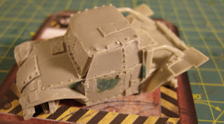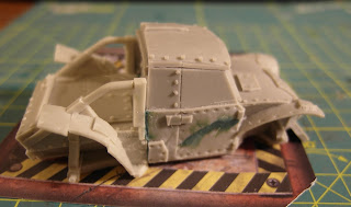 You get a very detailed resin mini. The cast details are very sharp. Not much to add.You have to clean some mold lines and fill few small holes. Generally car is very simple to build. Just glue luggage compartment and engine-driver parts. These two parts fits well, but any way you have to use green stuff to fulfill few hollow spaces. Also I use some liquid green stuff to flat surface. In my opinion this new “thing” from GW is great but needs to be diluted with water and next flat by sand paper.